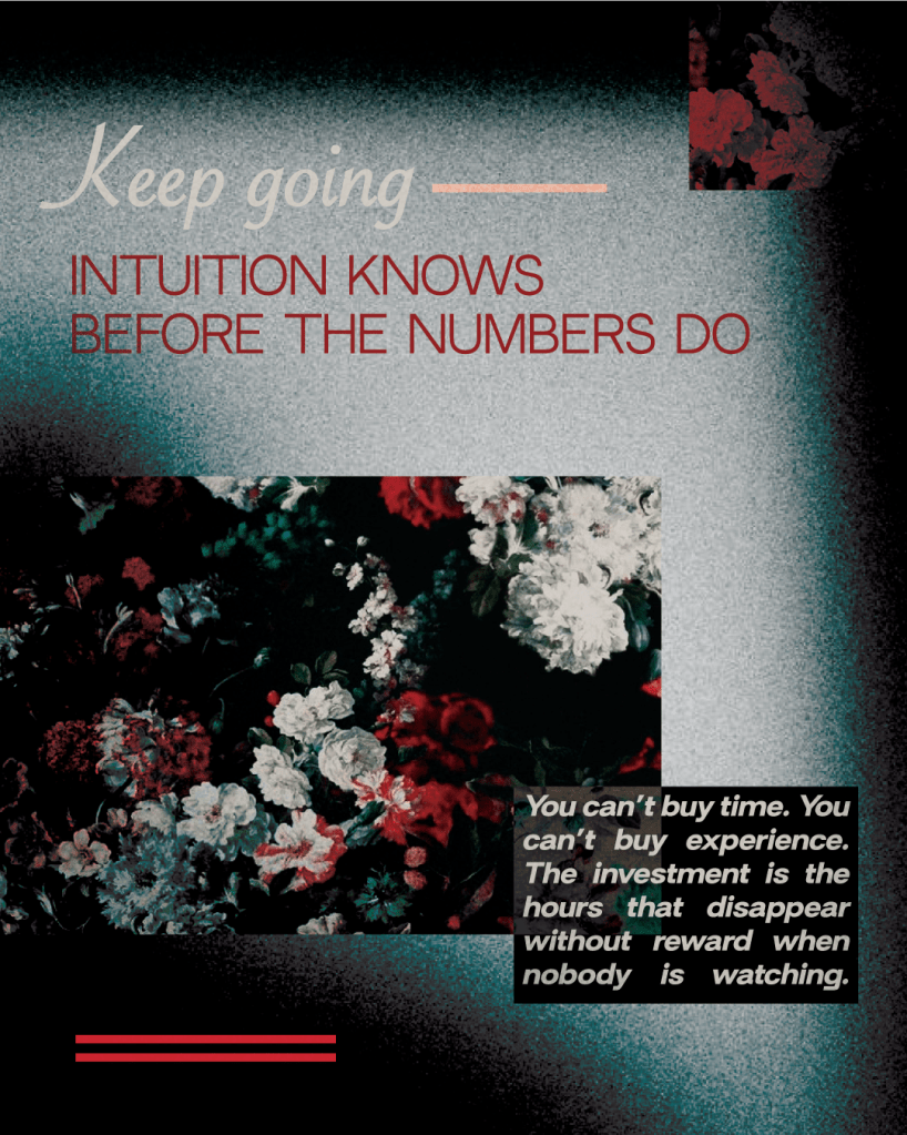 Experience is truly something you can’t buy, like respect. They’re hand in hand. Just like persistence & consistence – they equal the other, with time. Experience becomes equity, if it’s learned. Perspective is just how you know, it reveals value, simply because it happened and you did it. You’ll realise the people who tried to take advantage of you when you knew less, but only after. Maybe you didn’t double check something the first time, out of trust. Won’t do that again, will you dummy? Your dream might just be someone else’s invoice. On the flip side it’ll show those who gave great advice from the beginning, when it’s proven through time to be true. They cared. You’ll learn by blindly beginning. Novice experience will be preyed upon by those who aren’t as secure, watch for the wolves in sheep’s clothing.